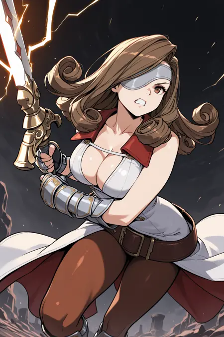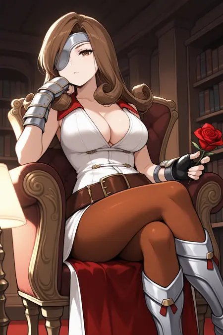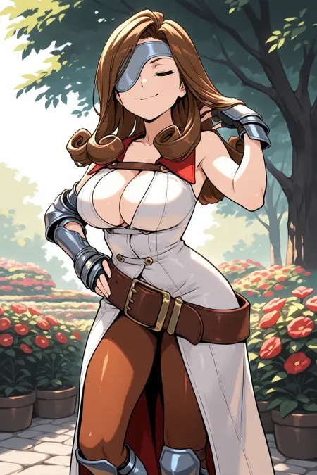Add "white dress, sleeveless dress, cleavage, gauntlets, brown belt, brown pantyhose, fingerless gloves, armored boots" for her typical look.