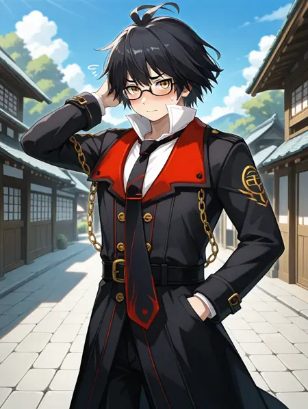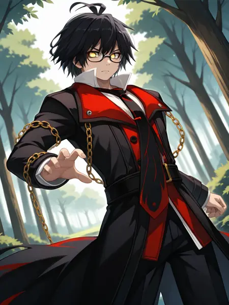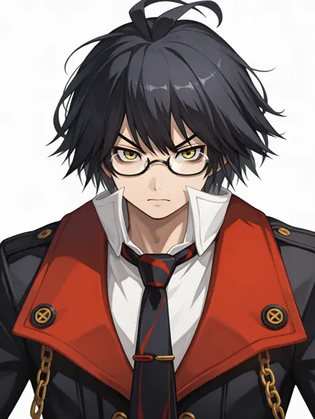 Nero, short hair, black hair messy hair, double ahoge, antenna hair, yellow eyes, glasses, black jacket, trenchcoat, black clothes, red clothes, white shirt, black and red necktie, red_details_on_jacket, chain on clothes,
