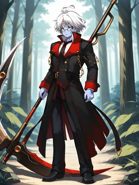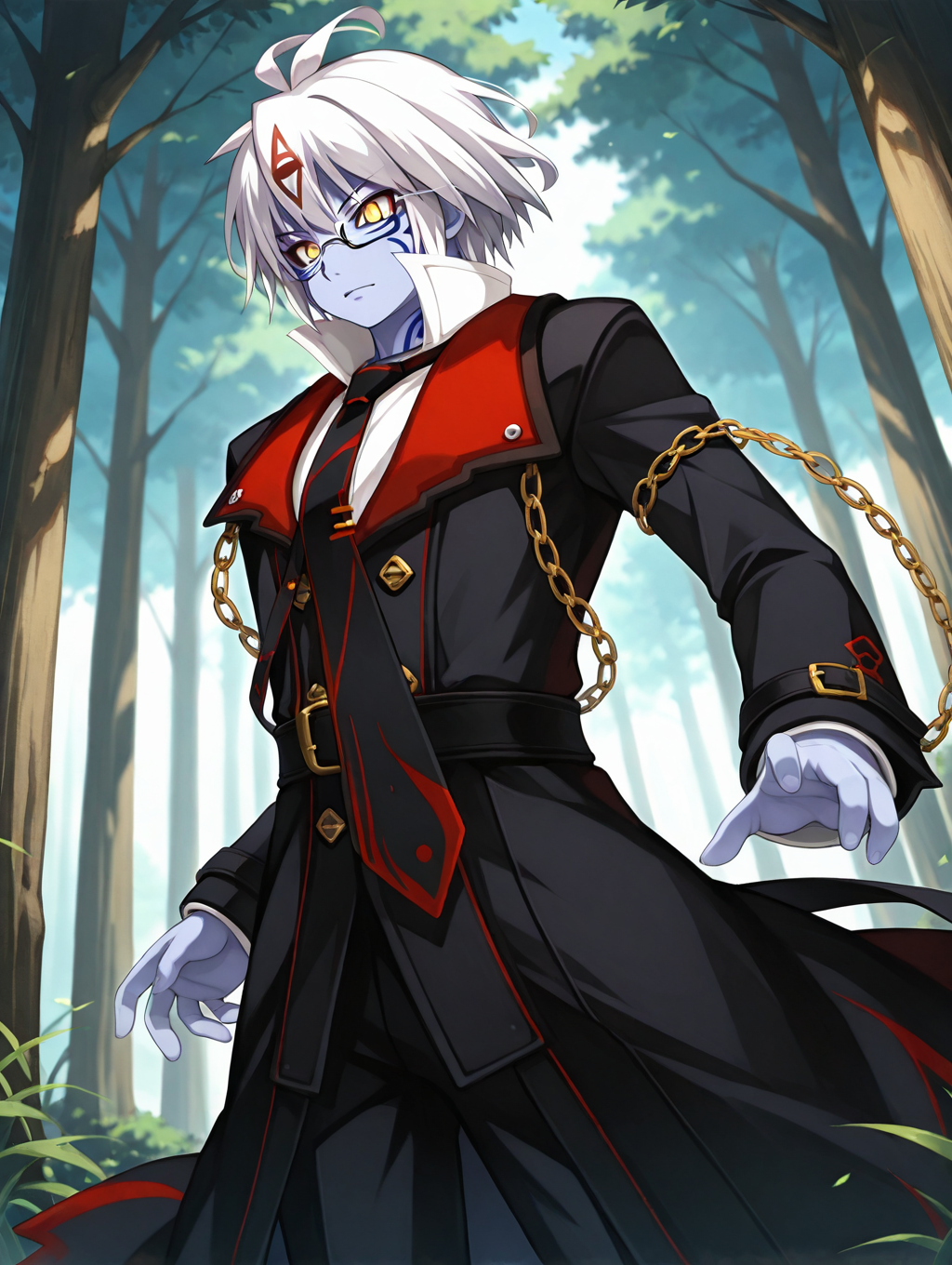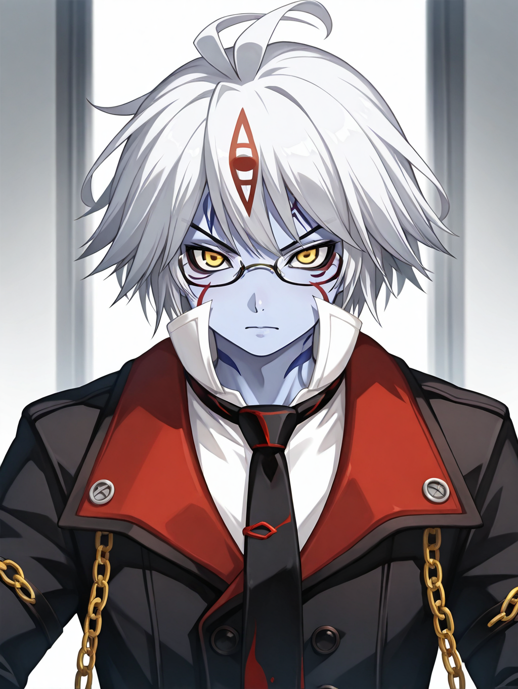 NeroReal, short hair, white hair messy hair, double ahoge, antenna hair, yellow eyes, colored skin, blue skin, facial marks, glasses, black jacket, trenchcoat, black clothes, red clothes, white shirt, black and red necktie, red_details_on_jacket, chain on clothes,