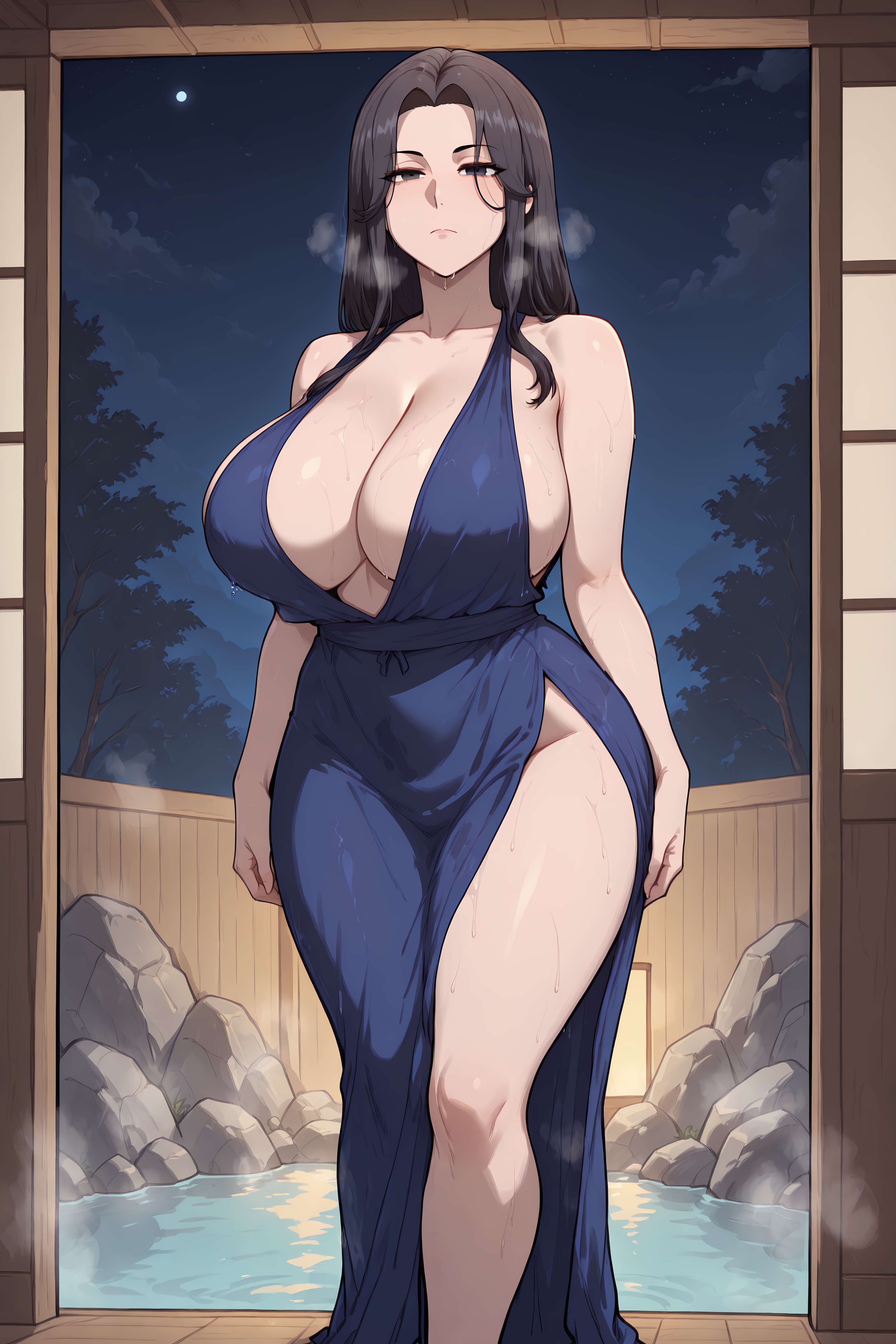 Marcella,long hair,black hair,black eyes,blue dress,plunging neckline,collarbone,bare shoulders,side slit,sideboob,heavy breathing,steaming body