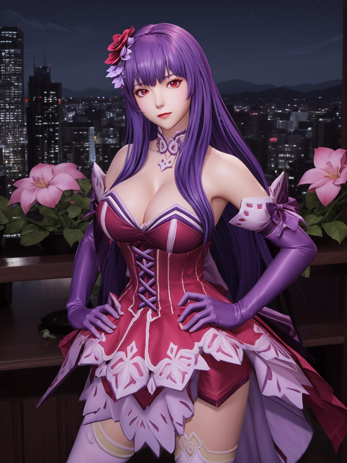 - WZRYwangzhaojunOXGS, 1girl, solo, elbow gloves, thighhighs, dress, long hair, purple hair, red eyes, bare shoulders, looking at viewer, hair flower, cityscape, night,