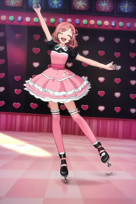 default costume, pink dress, pink short sleeve, black dress, pink thighhighs, ice skating boots