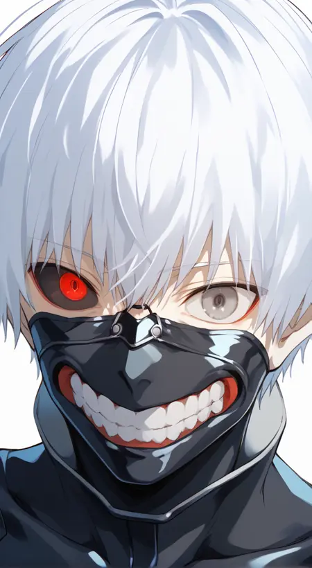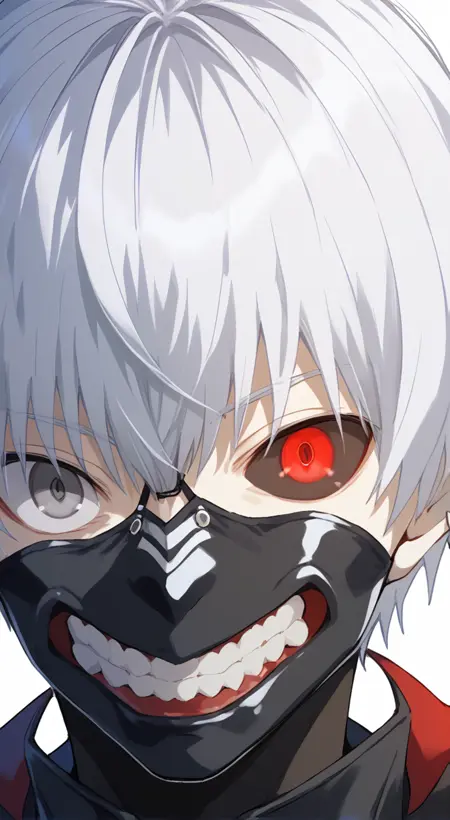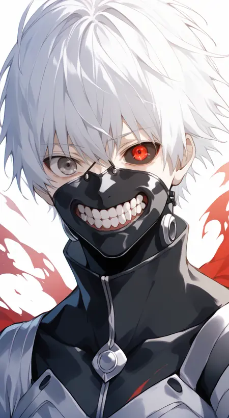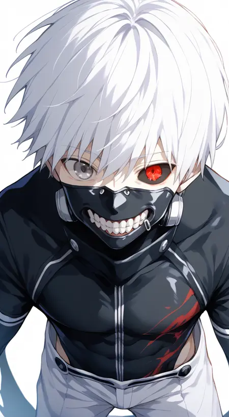 kaneki, kaneki ken, 흰 머리, 단발, 회색 눈, 빨간 눈, 검은 공막, 이안색, 입 마스크, 이빨