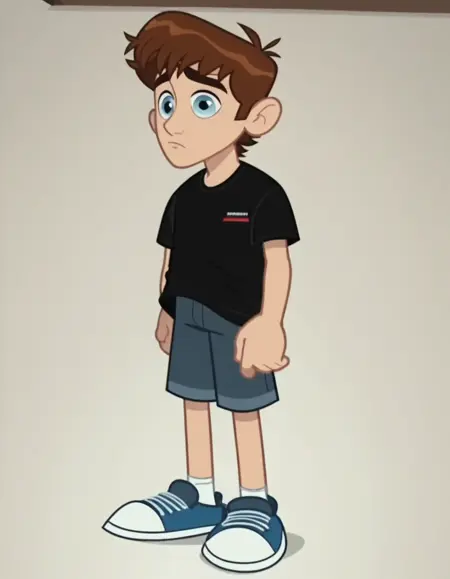 Lance_ThirtyacreSML, blue eyes, brown hair, shirt, 1boy, shorts, black shirt, t-shirt, dark blue shoes