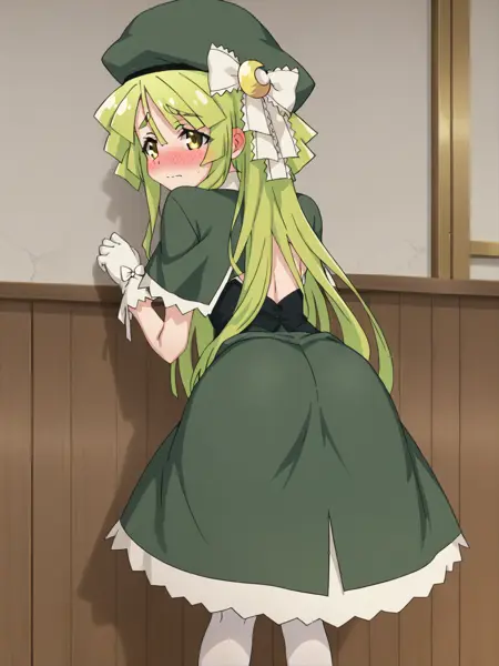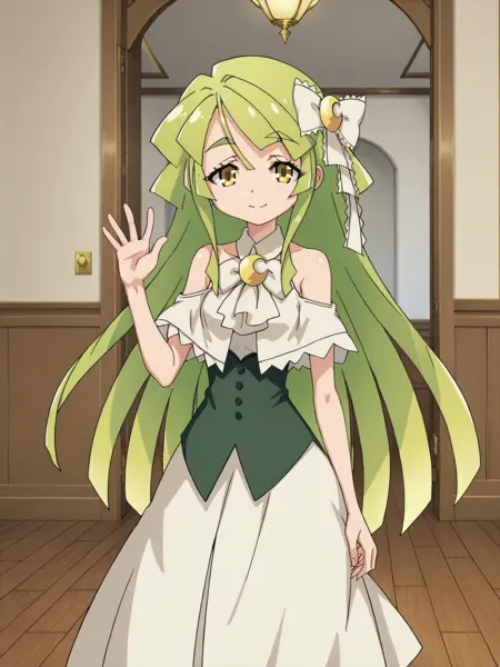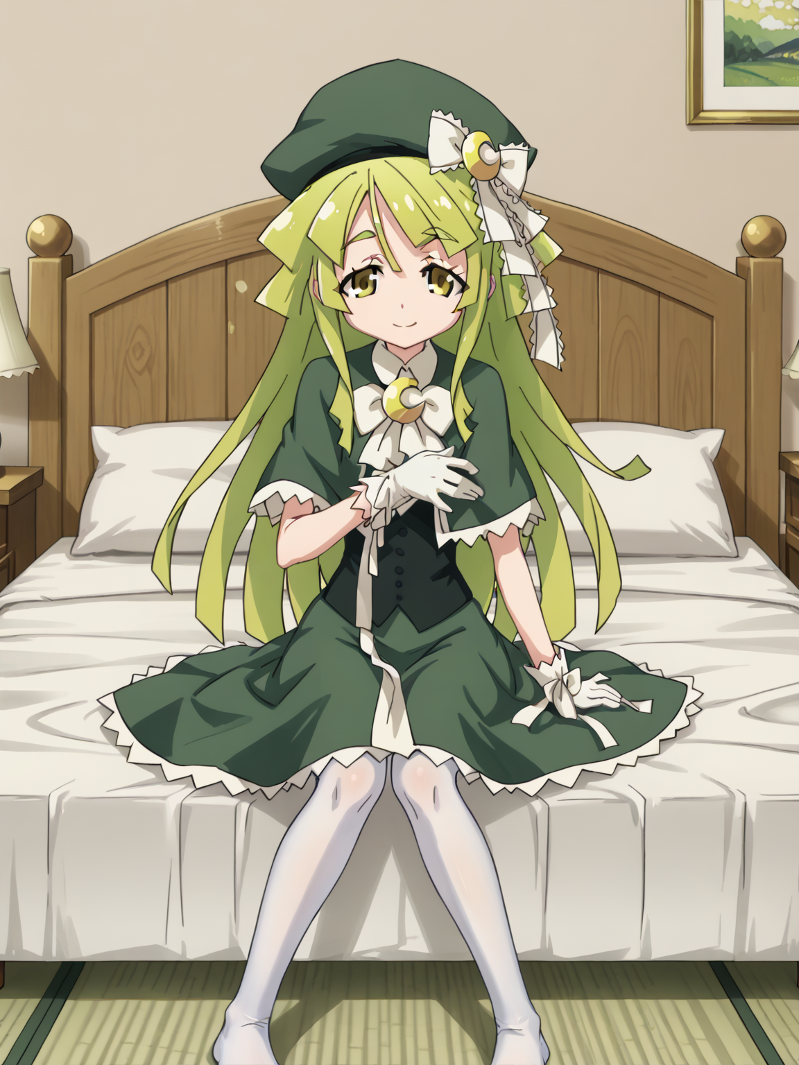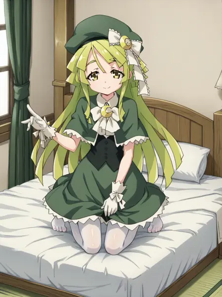 LunaLumen, long hair, green dress, hat, white gloves