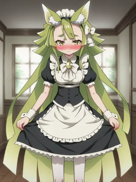 LunaTenebrae, very long hair, wolf ears, green dress, hat, white gloves,