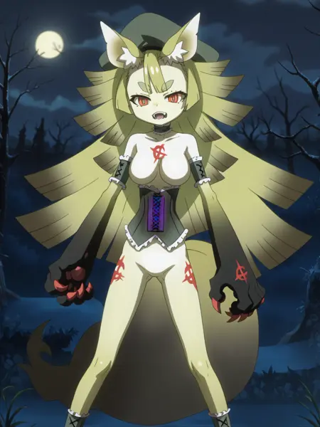 LunaLycanthrope, gradient long hair, wolf ears, corset, hat, wolf tail, claws,
