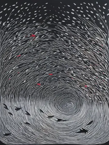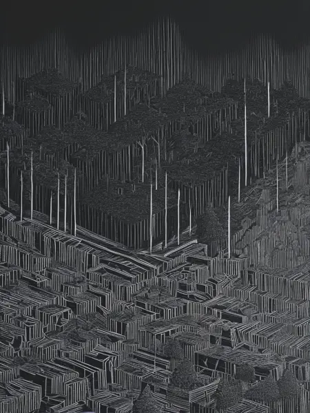 唐伍德的作品常融入反乌托邦、超现实主义和社会评论等元素,创作形式涵盖精细的钢笔墨水画、数字拼贴和混合媒介作品。他运用多种技法实现所需效果,包括层叠、纹理和大胆的色彩运用。