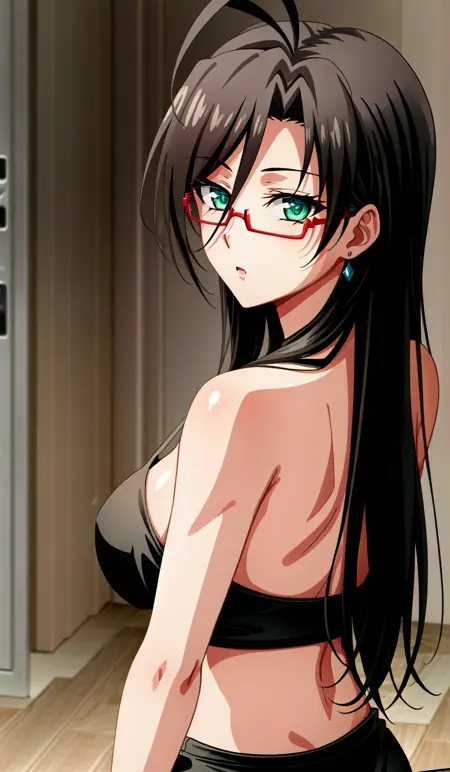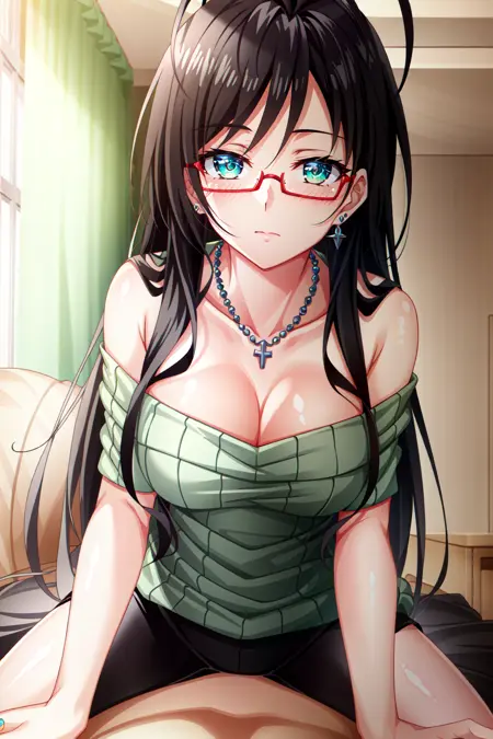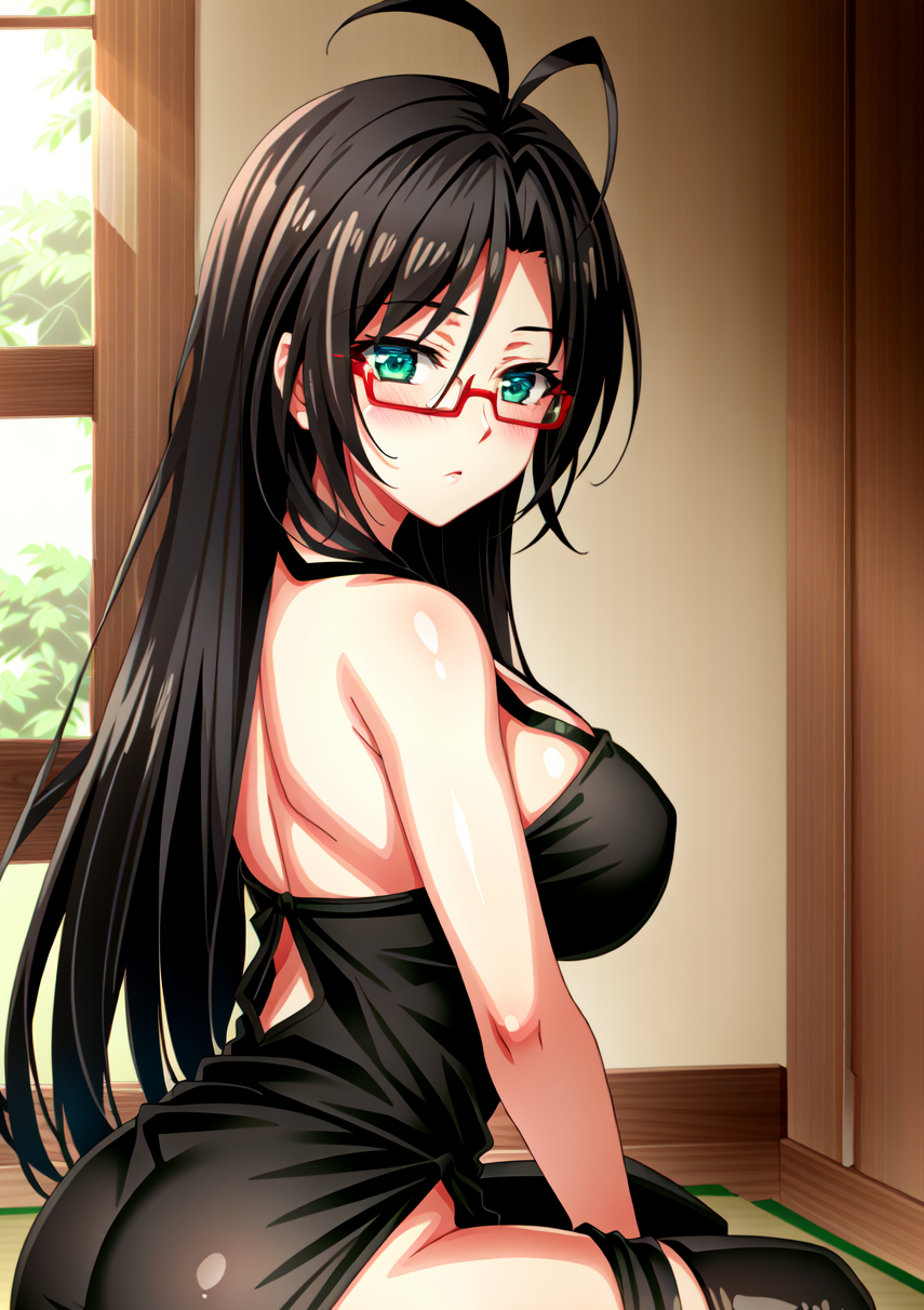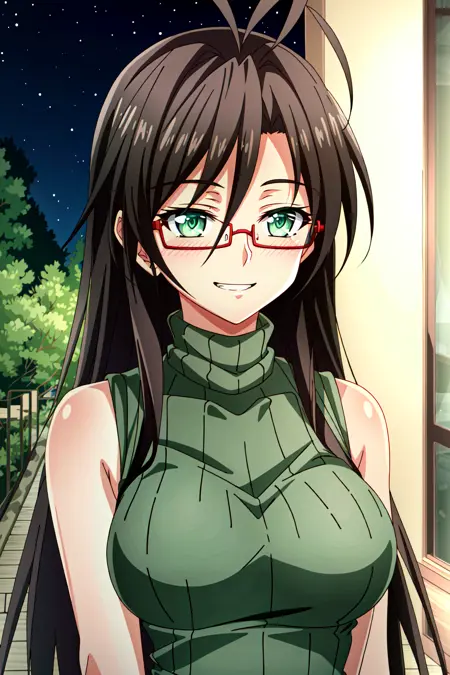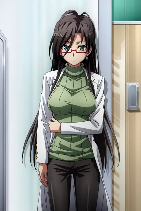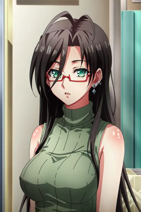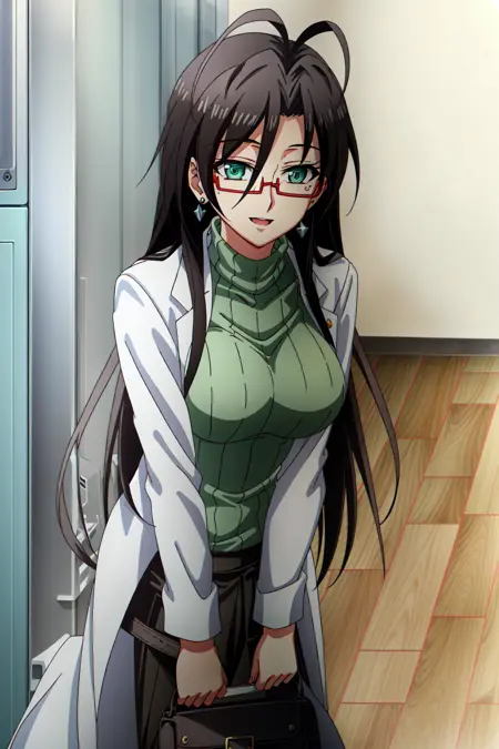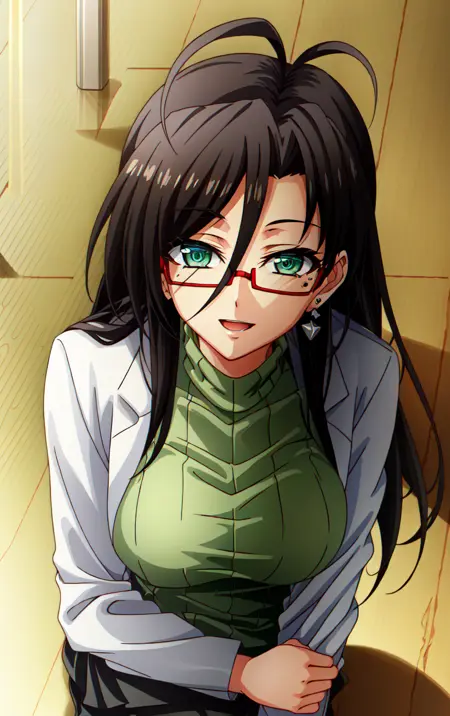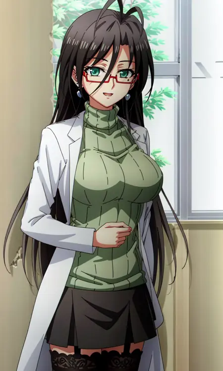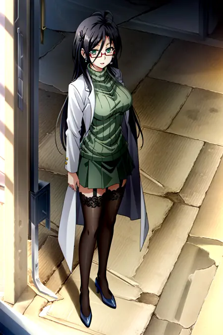 Chisato Hasegawa, 1girl, solo, thighhighs, glasses, long hair, skirt, breasts, labcoat, green eyes, garter straps, large breasts, turtleneck, sweater, ribbed sweater, black hair, high heels, antenna hair, black background, sitting, brown hair, bare shoulders, sleeveless turtleneck, smile, miniskirt, sleeveless