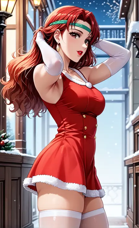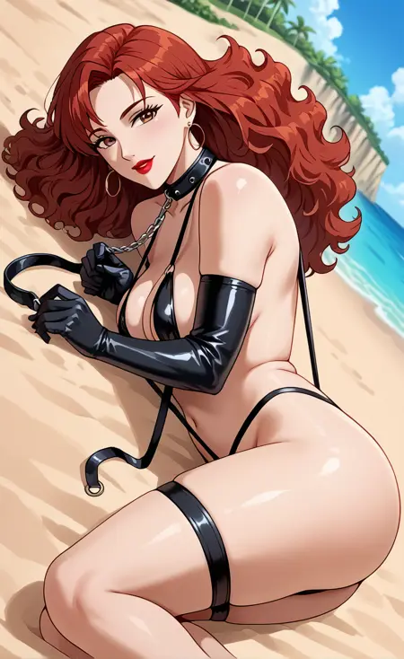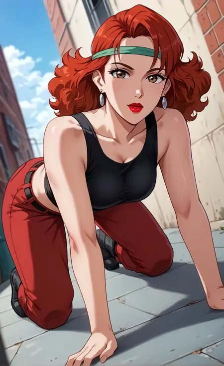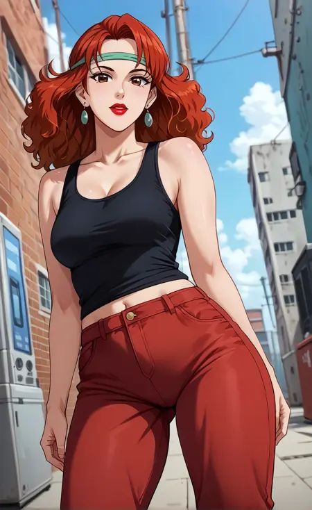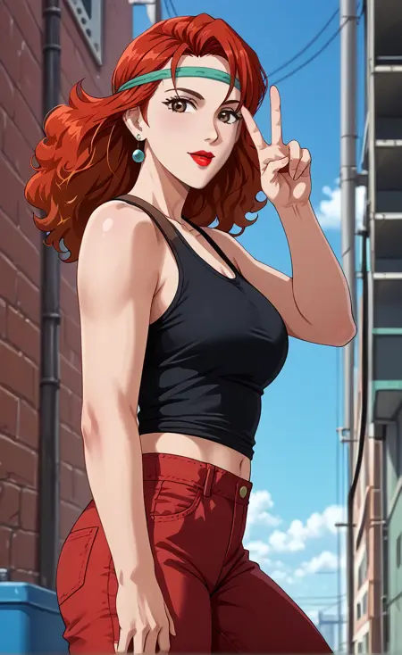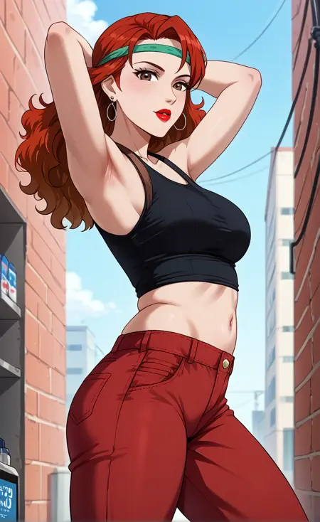 (midriff, red_hair, brown_eyes, black_eyes, wavy_hair, lipstick, earrings, headband),
