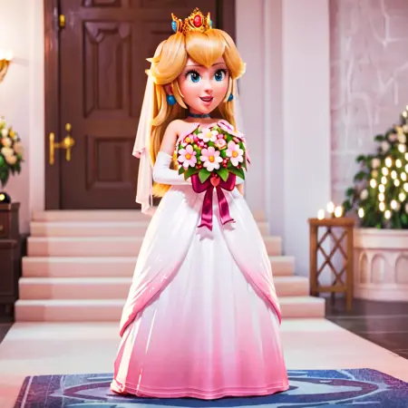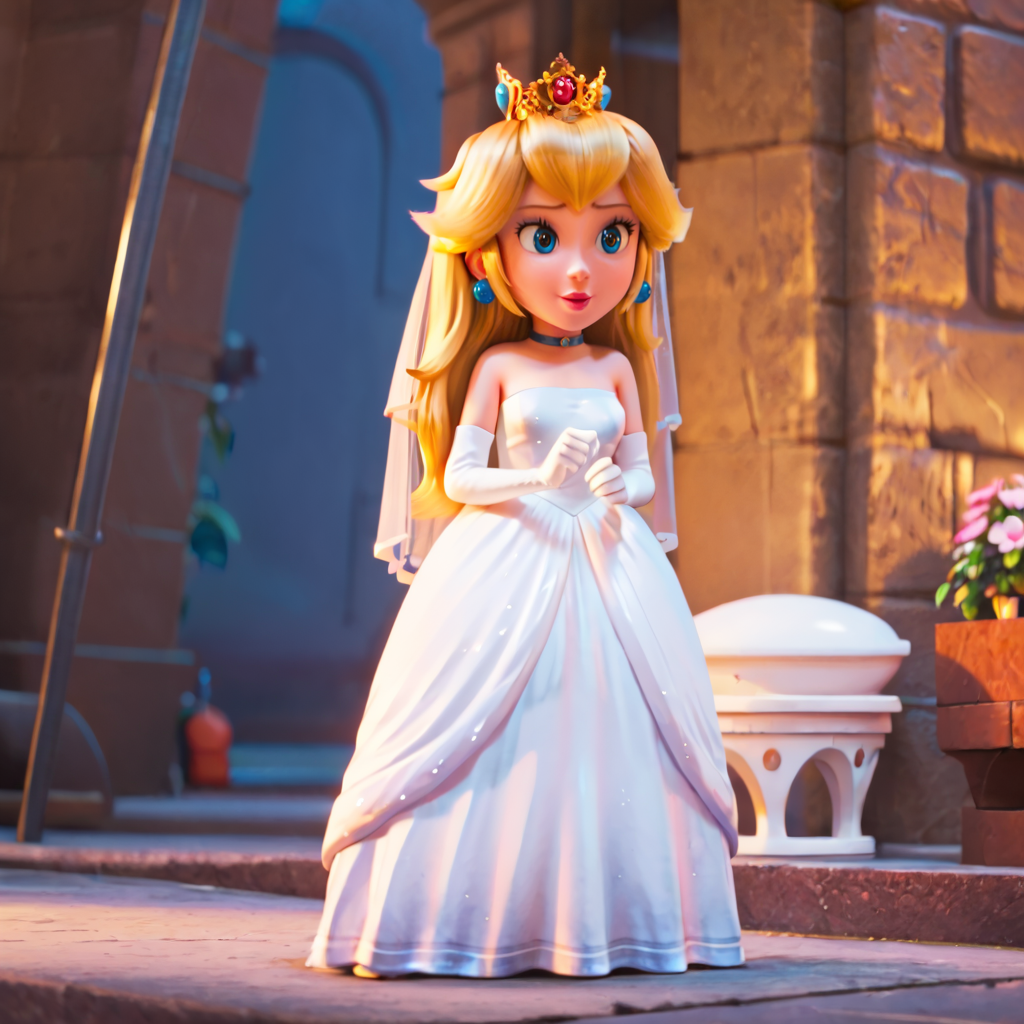 웨딩 복장 트리거: PeachWedding, 프린세스 피치, 흰 드레스, 1girl, 금발 머리, 팔꿈치 장갑, 보석, 긴 머리, 파란 눈, 귀걸이, 왕관, 흰 장갑, 웨딩 드레스, 허리끈 없는 드레스, 어깨 노출, 초커, 베일