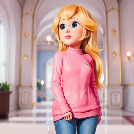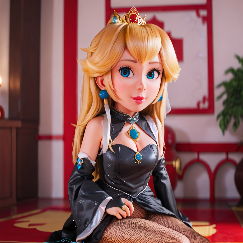 트리거: Peach, 1girl, 분홍 드레스, 금발 머리, 팔꿈치 장갑, 보석, 왕관, 긴 머리, 파란 눈, 귀걸이, 흰 장갑, 풍성한 소매, 입술
