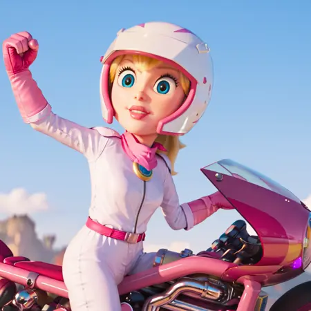 오토바이 복장 트리거: PeachMotorcycleGear, 1girl, 금발 머리, 왕관, 분홍 장갑, 분홍 바디수트, 프린세스 피치, 파란 눈, 분홍 신발, 바이커 복장, 바이크수트, 카우보이 샷