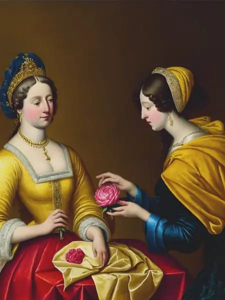 马蒂尼的风格以优雅、精致和对细节的关注为特征。他的画作常描绘身形纤细、姿态优美的形象,衣褶繁复细腻,色彩鲜艳明丽。他善于捕捉面部表情的微妙变化,以极高的敏感度传达情感。