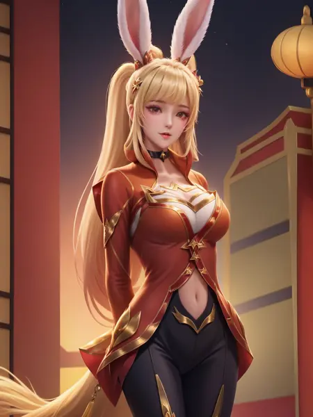 - WZRYgongsunliYP, 1girl, solo, rabbit ears, navel, looking at viewer, breasts, clothing cutout, long hair, choker, blonde hair, wide sleeves, pants, navel cutout, long sleeves, bangs, hair ornament, medium breasts, dress, cityscape, night, pool,