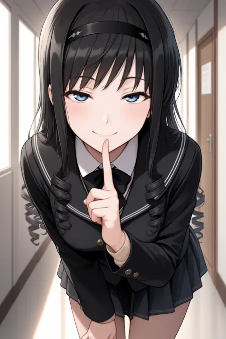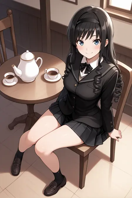 • 为她的制服添加:“黑色发带、黑色水手领、有领衬衫、颈带、黑色西装外套、黑色蝴蝶结、长袖、百褶裙、黑色短裙、黑色袜子、船鞋”。