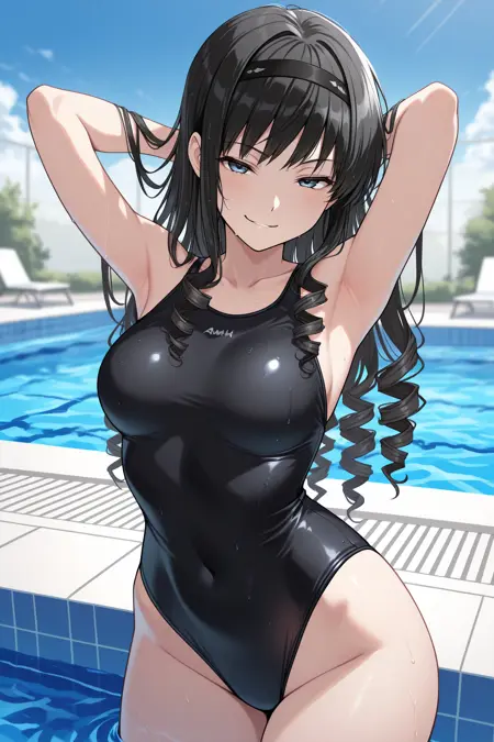 彼女の水着には「黒いヘアバンド、黒いワンピース水着」を追加してください。