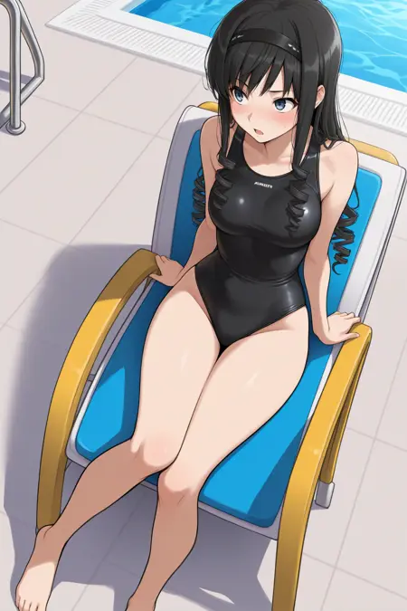 • 为她的泳装添加:“黑色发带、黑色连体泳衣”。
