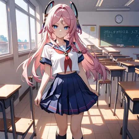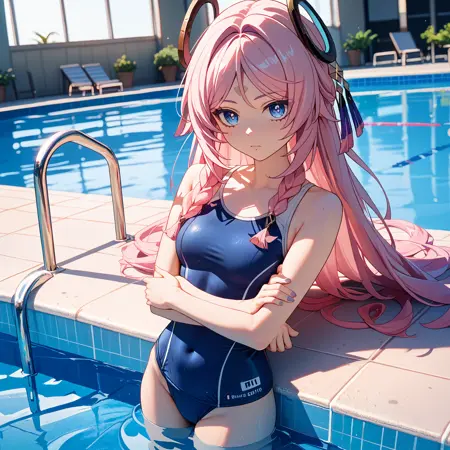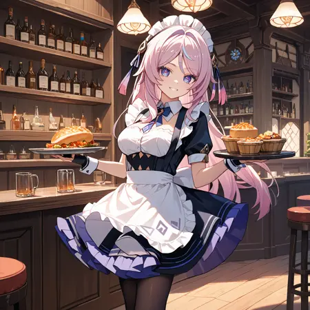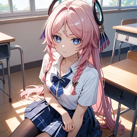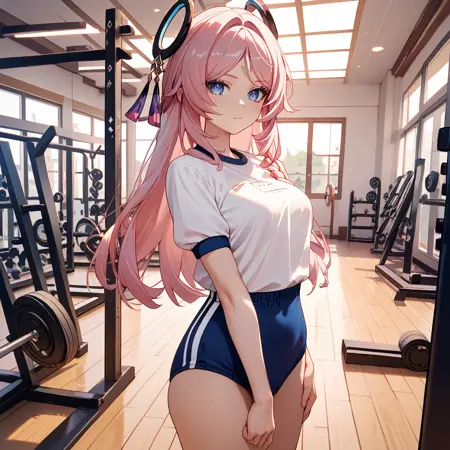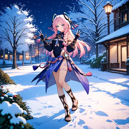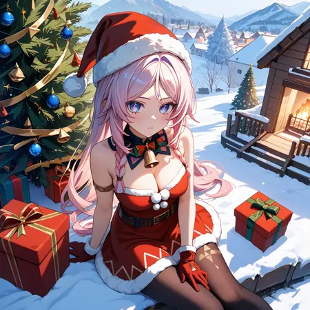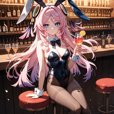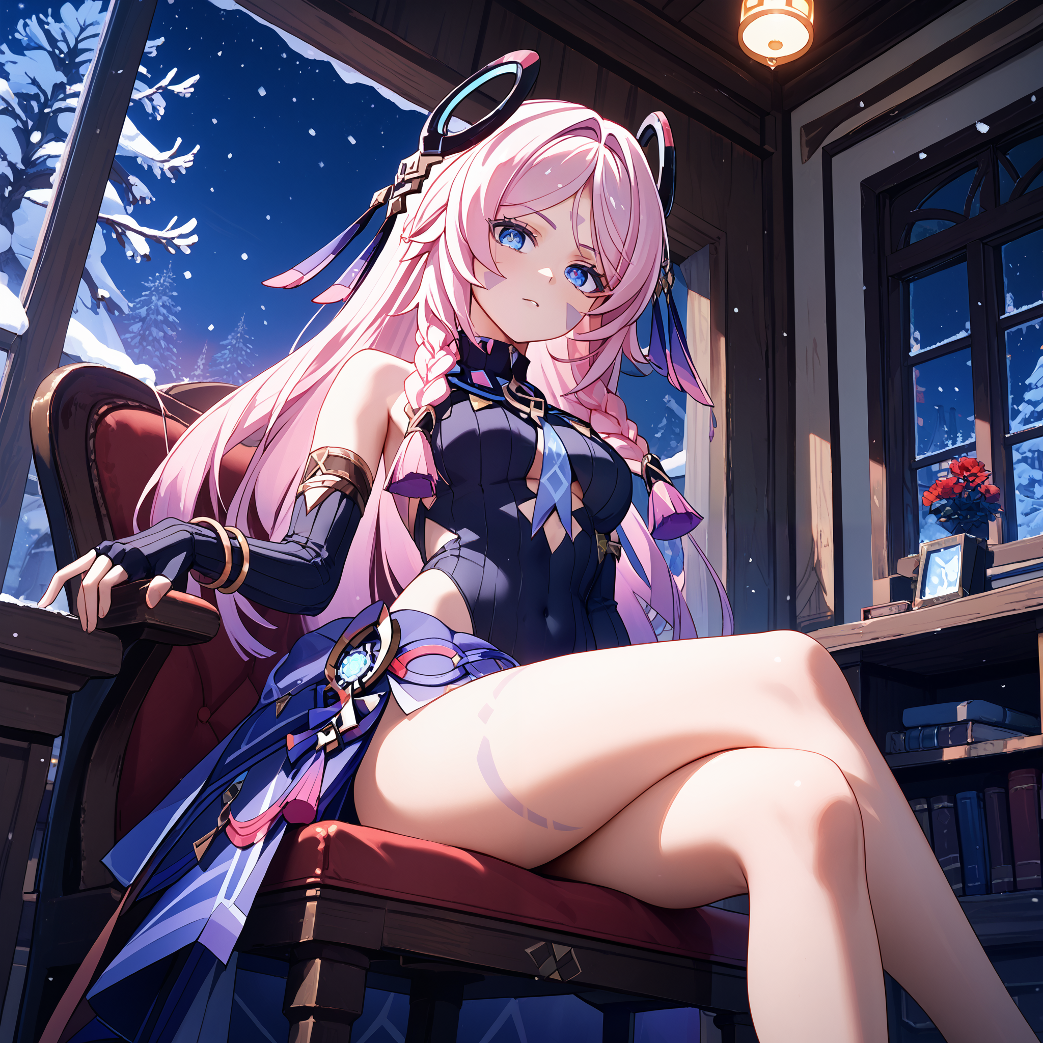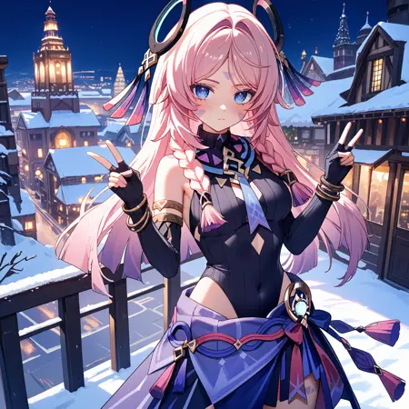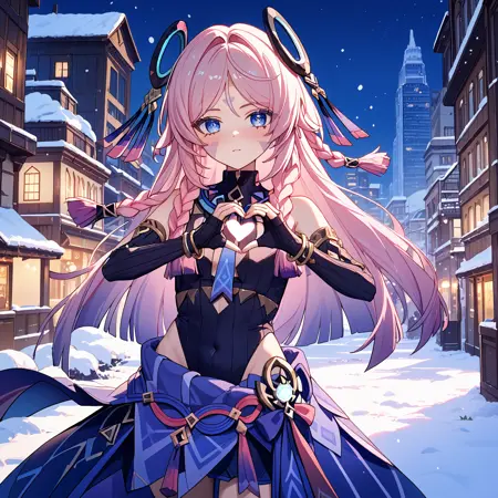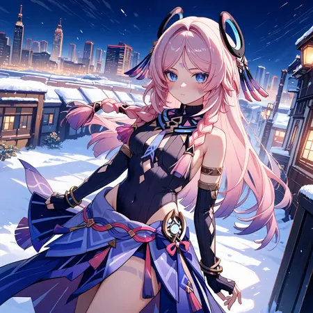 Default : citlali \(genshin impact\), pink hair, long hair, twin braids, blue eyes, hair ornament, facial tattoo, headgear, black leotard, covered navel, waist cape, detached sleeves, partially fingerless gloves, bracelet,