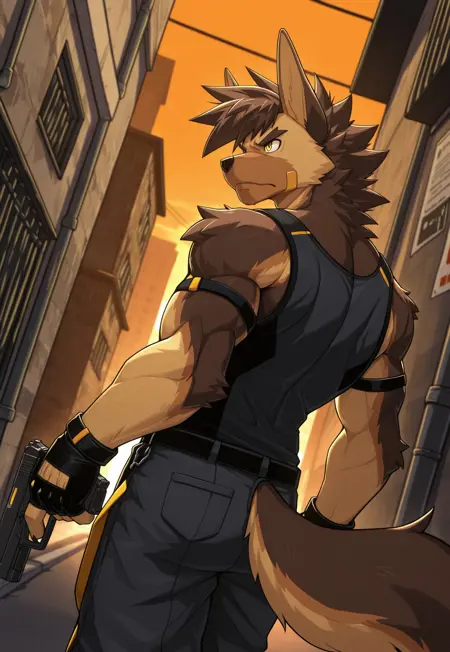プロンプト:zheman、犬男、黄色い目、尾、多数の傷跡、顔に絆創膏