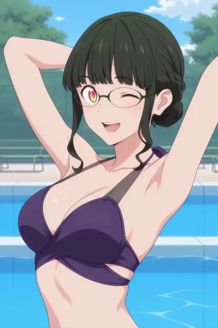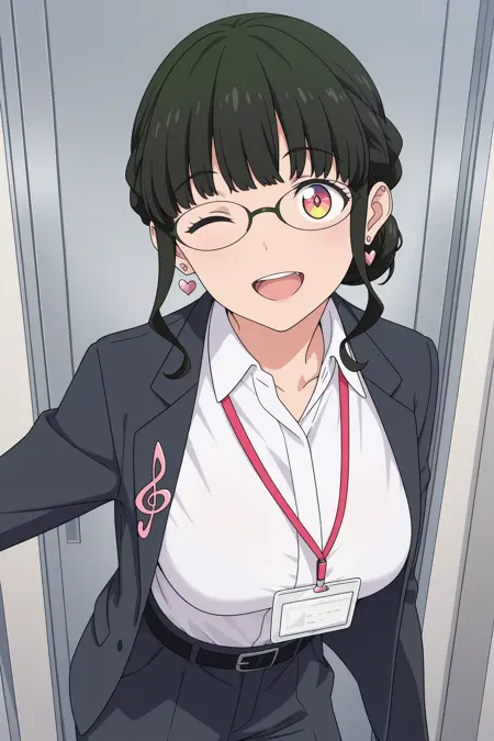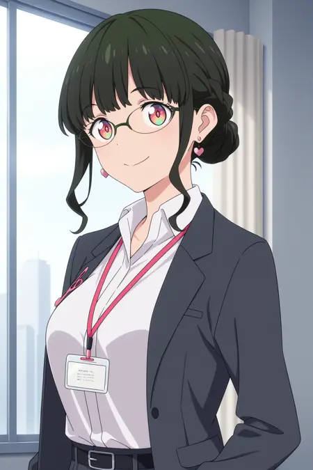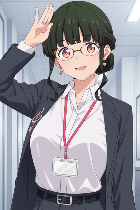 anosillus the 2nd, dark green hair, short hair, half up braid, single hair bun, blunt bangs, sidelocks, multicolored eyes, glasses, heart earrings, grey jacket, musical note ornament, treble clef, white shirt, collared shirt, lanyard, open jacket, belt, grey pants, white footwear, flats