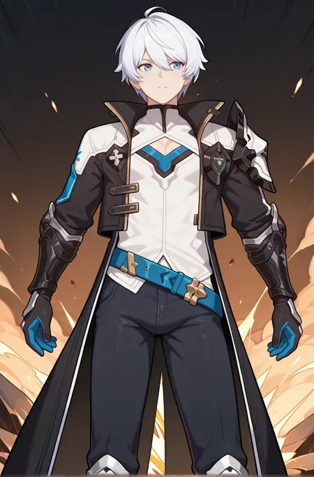 Default Clothes: default_clothes, black jacket, armor, white shirt, clothing cutout, blue belt, gauntlets, armored gloves, high collar, turtleneck, two-tone gloves, blue gloves, black gloves,