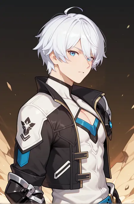 Prompt: kevin, kevin kaslana, white hair, short hair, blue eyes, hair between eyes