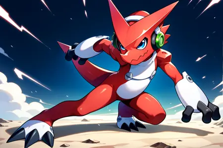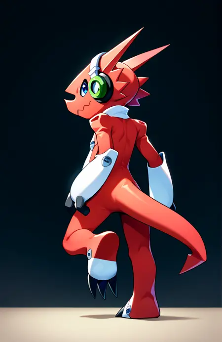 プロンプト: shoutmon, no humans, red skin, blue eyes, headphones