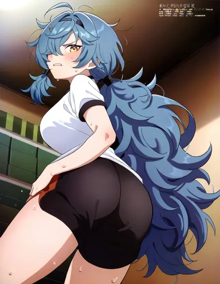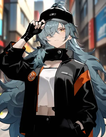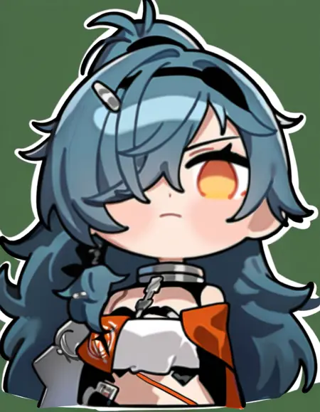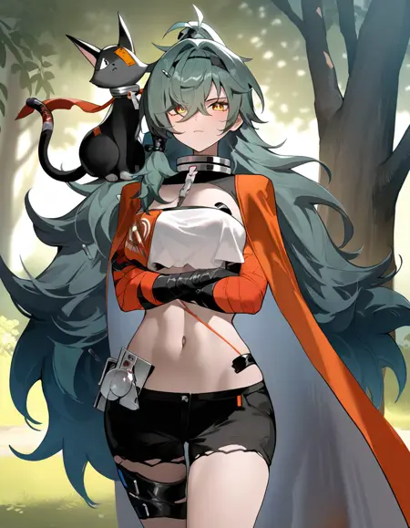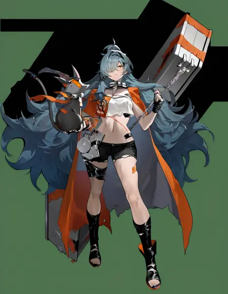 xytx-cihui,1girl,solo,very long hair,messy hair,blue hair,hairband,yellow eyes,hair over one eye,breasts,navel,chain,collar,tube top,gloves,torn clothes,crop top,midriff,shorts,
