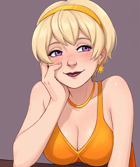 General relevant prompts: 1girl, short hair, bob cut, blonde hair, white hair, hairband, purple eyes