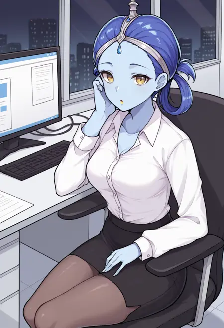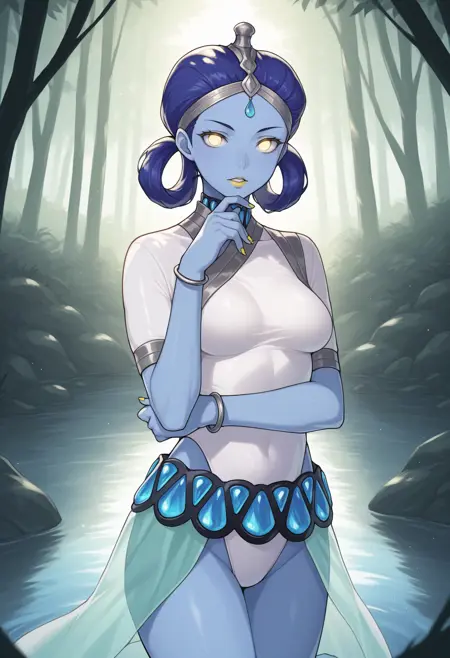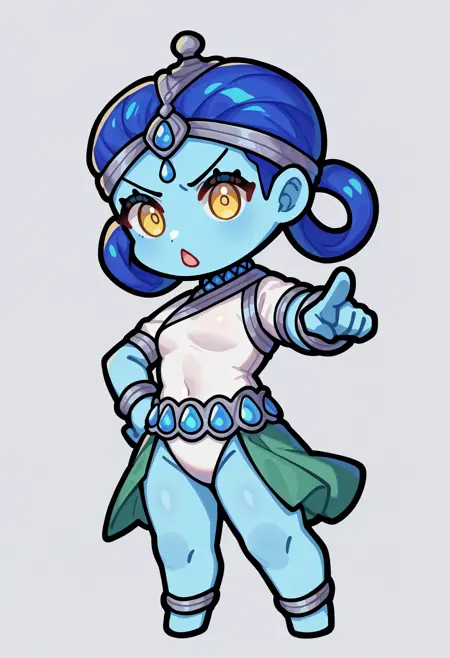 기본 외모: apsrs, 파란 머리, 머리 고리, 관모, 이마 보석, 노란 눈, 파란 피부, 노란 입술, 목 고리, 흰 레오타드, 짧은 소매, 팔찌, 노란 손톱, 중간 크기 가슴, 파란 벨트, 쇼걸 치마, 녹색 치마