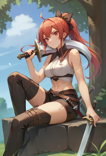 | 학습된 단어 | eris, red eyes, red hair, long hair, hairband, ahoge, // , ponytail, hairbow, 복사됨! sleeveless, cropped shirt, black shorts, belt, thigh boots, off-shoulder jacket, // , cat hood, black bra, black panties, side-tie panties, black thighhighs, 복사됨! |