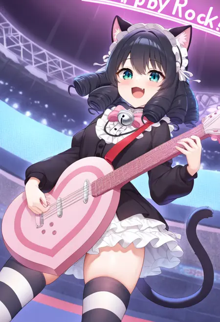 holding guitarやinstrumentなどの楽器系のプロンプトを追加すると、シアンが使用しているハート型のギターを手に持つようになります。