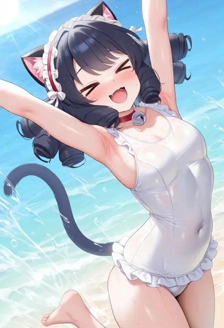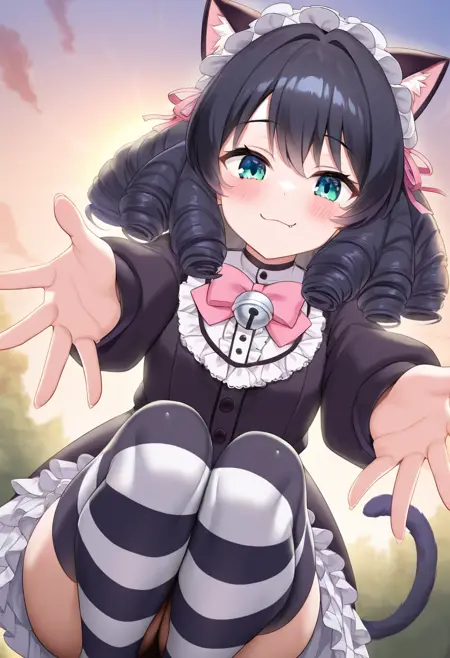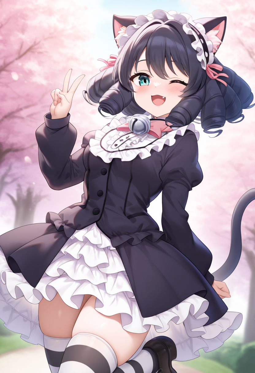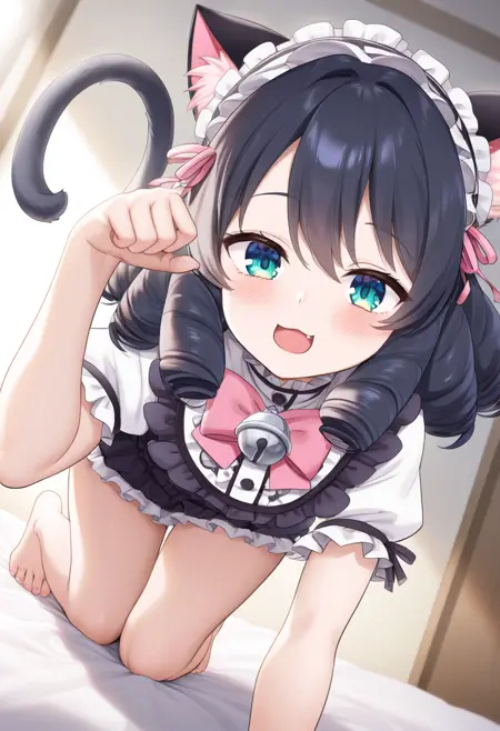 green eyes,blue eyes,curly hair,black hair,fang,cat ears,cat tail,