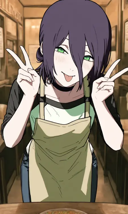 reze \(链锯人\), 1个女孩, 绿色眼睛, 中长发, 发丝遮眼, 单发髻, 项圈