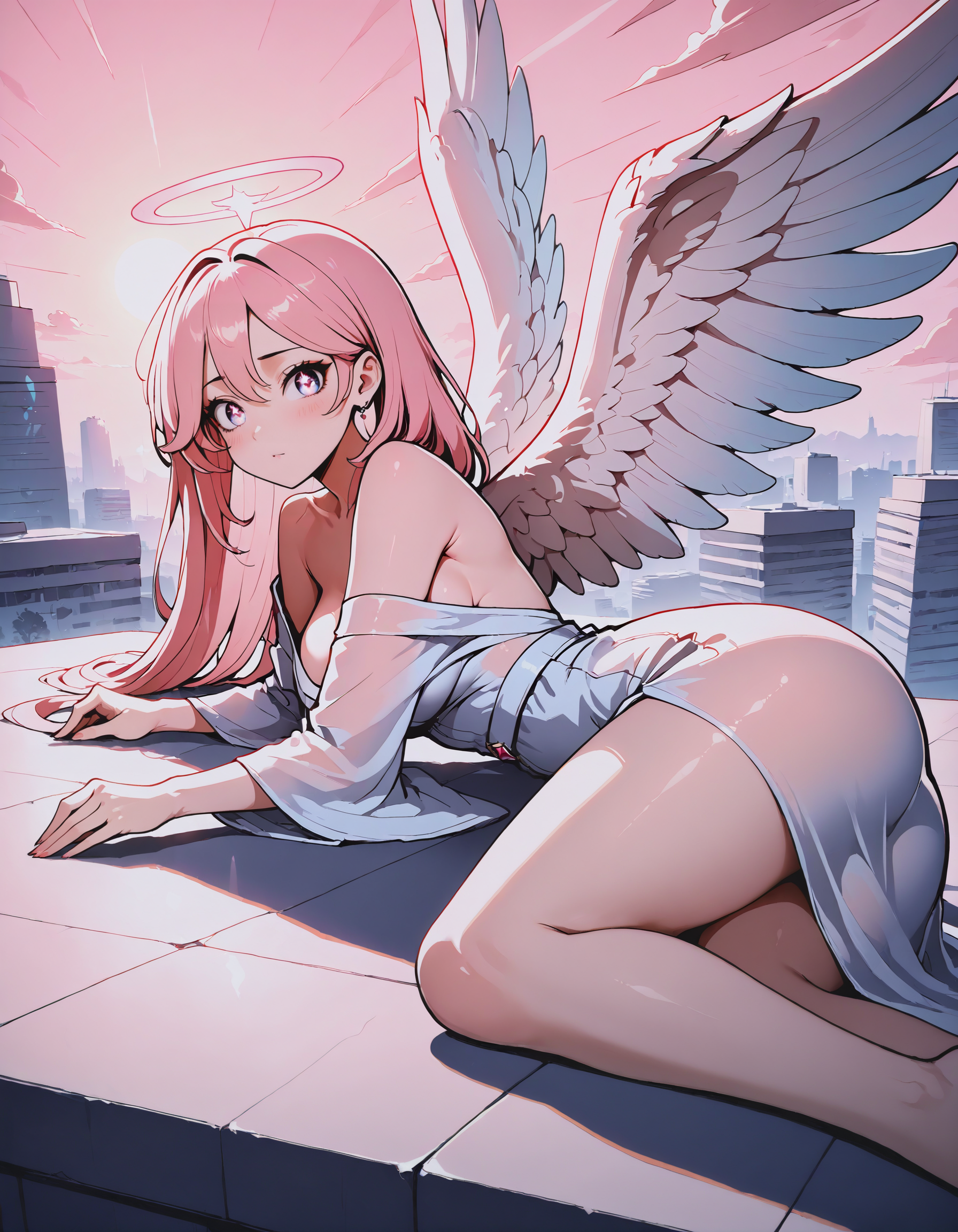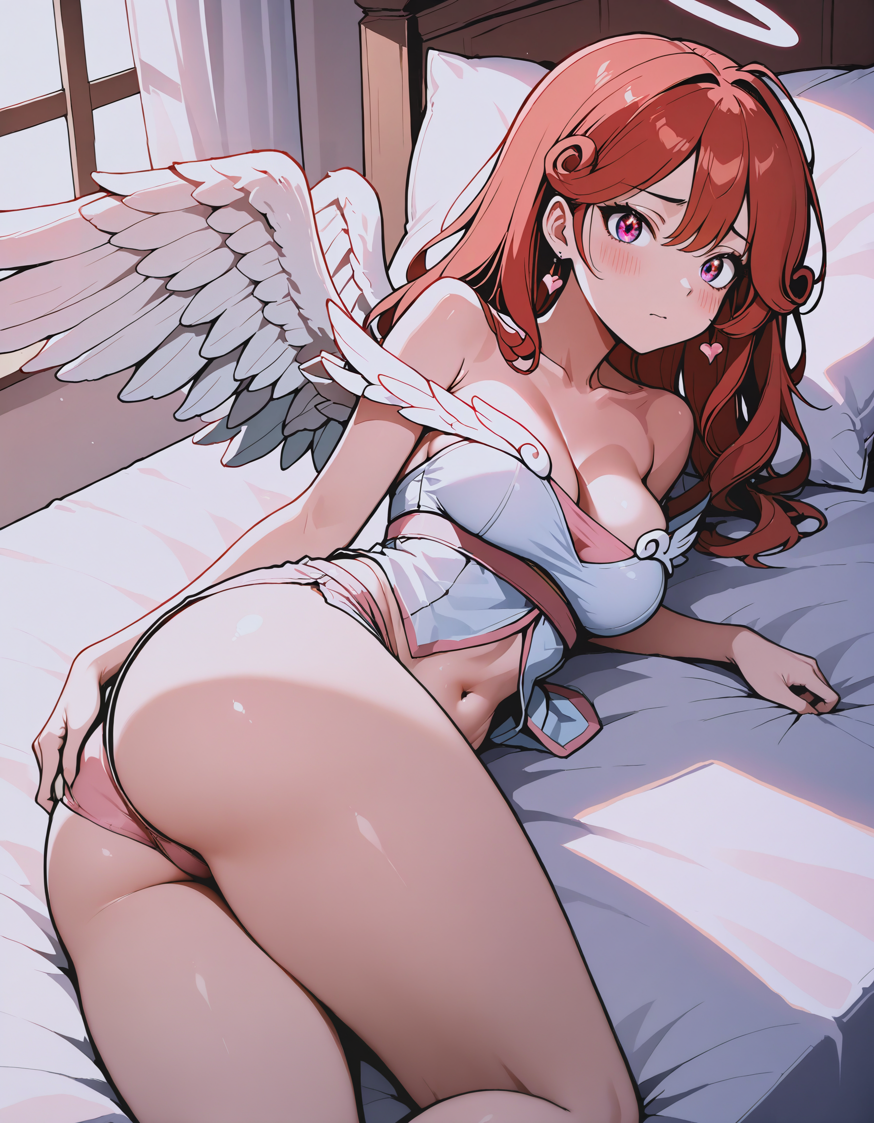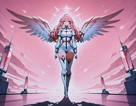 제안: 분홍/빨간 머리와 눈, 빨간색과 흰색 옷, 천사 날개, 간호사 모자,
