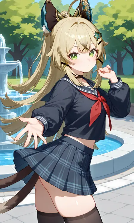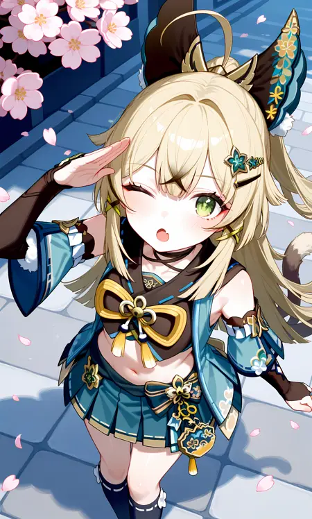 kirara(原神),猫耳,长发,极长发,发饰,绿眼睛,呆毛,猫尾,发夹,多条尾巴,两条尾巴,金发