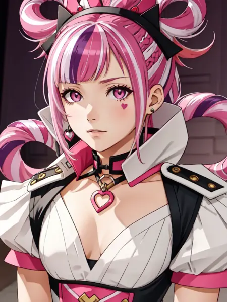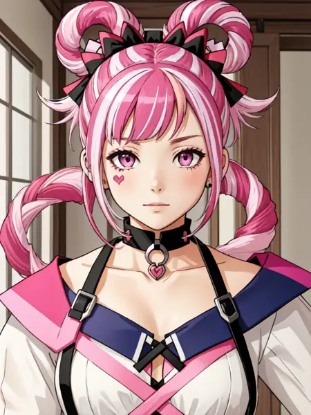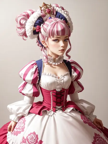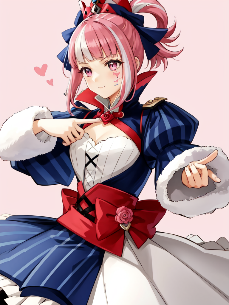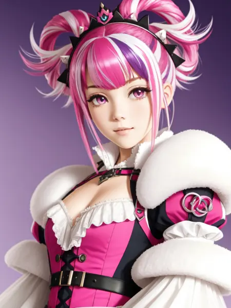 ホルテンシアの髪の輪を含めて生成したい場合は、必ず (hair rings, pink hair, multicolored hair:1.3) を追加してください。
