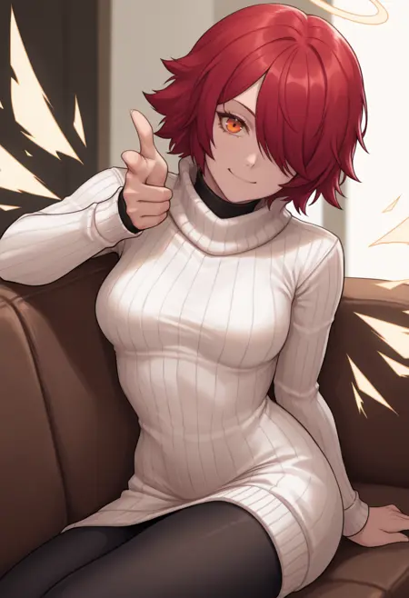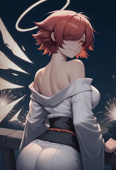 默认服装: exidef, 分离的翅膀, 能量翅膀, 短发, 红发, 头发遮住一只眼睛, 光环, 橙色眼睛, 白色夹克, 员工证, 黑色腰带, 腰带包, 短袖, 袍袖, 黑色手套, 无指手套, 黑色短裙, 超短裙, 黑色连裤袜