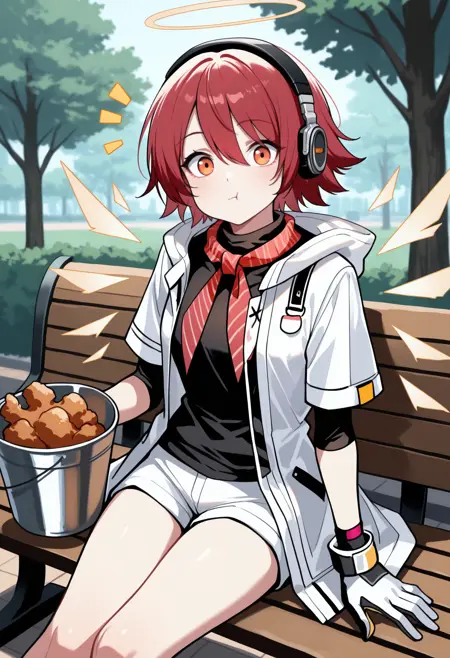 城市骑手: exicity, 分离的翅膀, 能量翅膀, 短发, 红发, 头发在眼睛之间, 耳机, 光环, 橙色眼睛, 白色外套, 连帽外套, 帽子放下, 外套敞开, 短袖, 黑色衬衫, 红色围巾, 双色手套, 白色手套, 黄色手套, 白色短裤, 超短裤