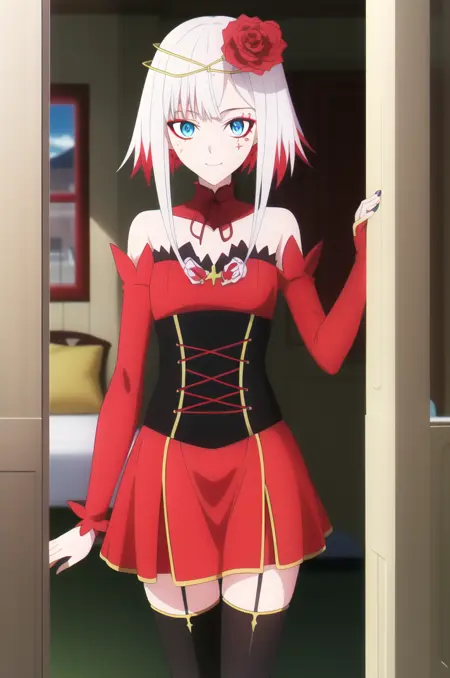 outfit_2, detached collar, red ribbon neck ribbon, red dress, corset, bare shoulders, detatched sleeves, black thighhighs, zettai ryouiki,
