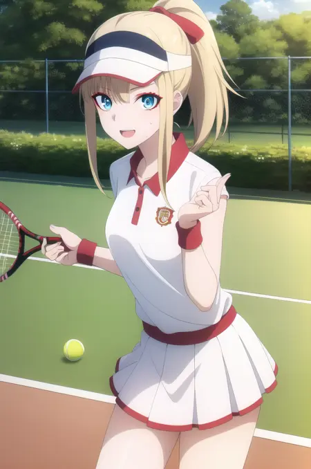 destiny_default, blonde hair, blue eyes, red hairband, medium hair, red eyeshadow, eyeshadow,
