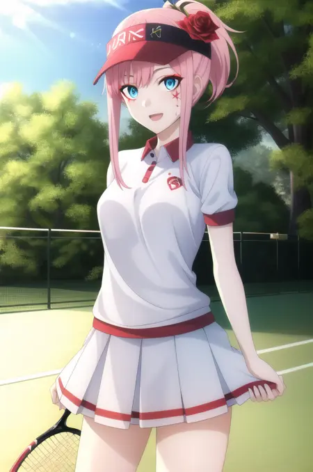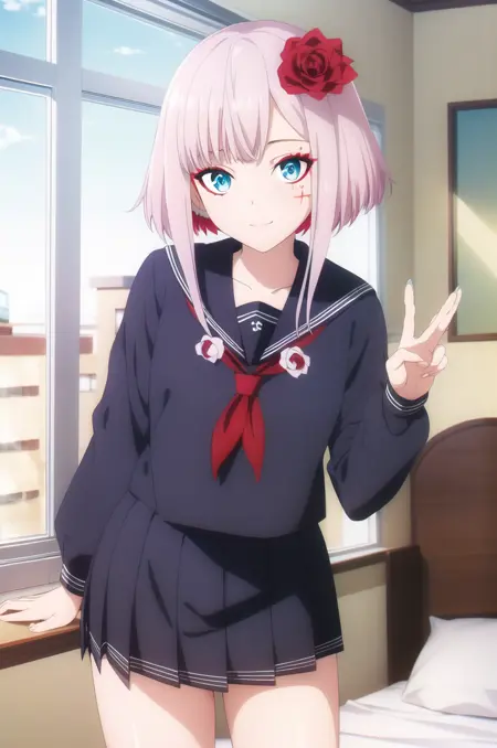 destiny_battle, red colored inner hair, pink hair, medium hair, blue eyes, eyeshadow, red eyeshadow, hair flower, hair ornament, red rose, facial mark, short hair with long locks, thorns,