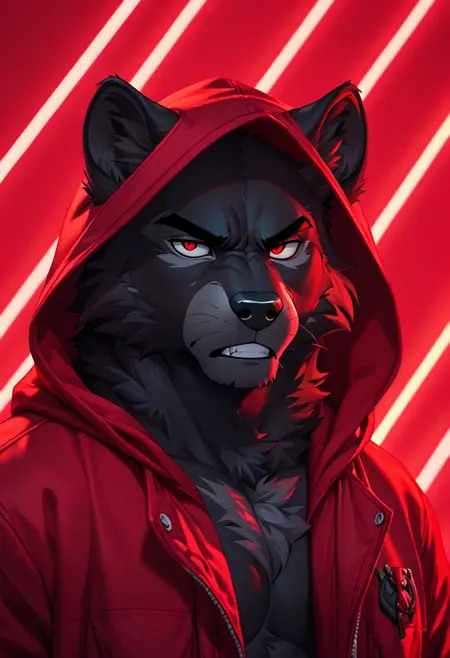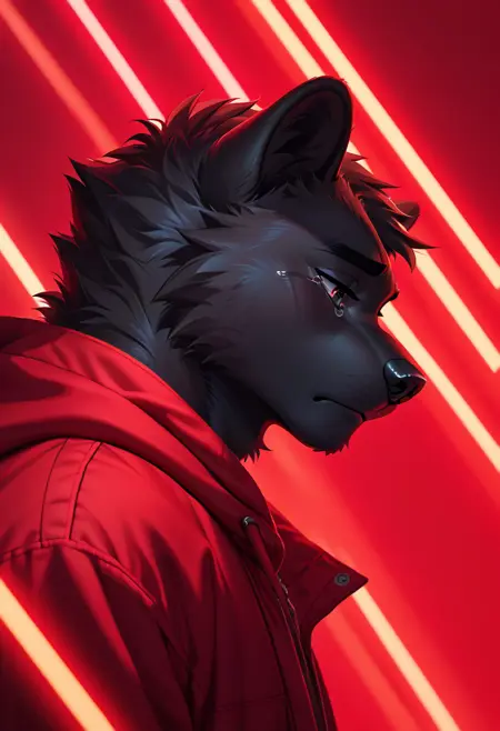 Masterpiece, score_9, score_8_up, beautifully detailed, male, anthro, furry, panther, black fur, black body fur, red hoodie, (lines_light_background:1.2), gradient black to red background, white neon line background, dark, sad, look down, side view, tear