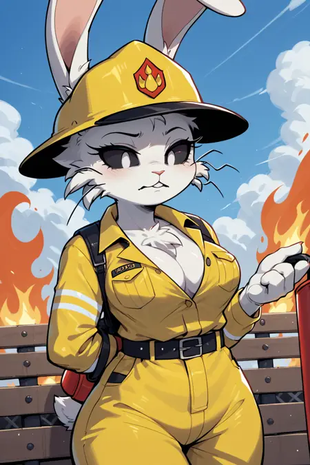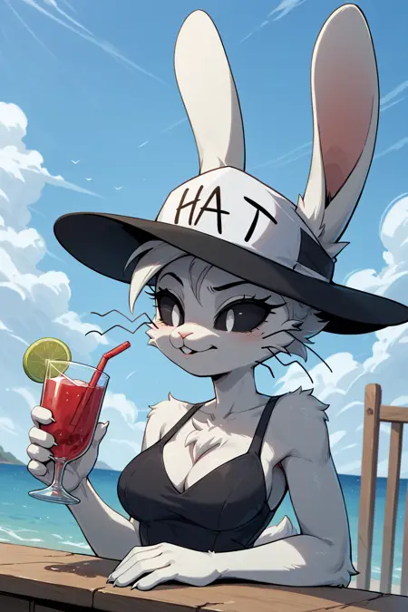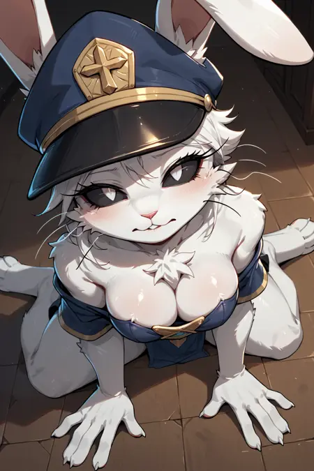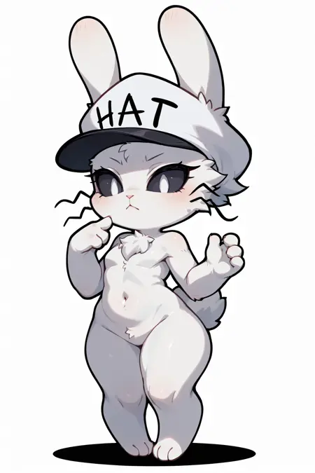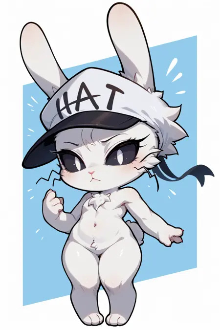 触发词:兔形动物、兔子、拟人化、女性、黑色巩膜、白色瞳孔、帽子、白色身体、白色毛发、胸部毛簇、弯曲的胡须、无性别特征下体、无乳房特征