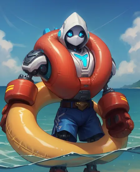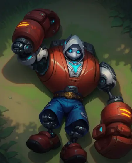 Trigger: B00mBl1tz, hood, faceless, round eyes, robot, blue shorts, mecha, belt, no humans