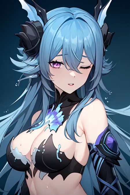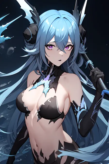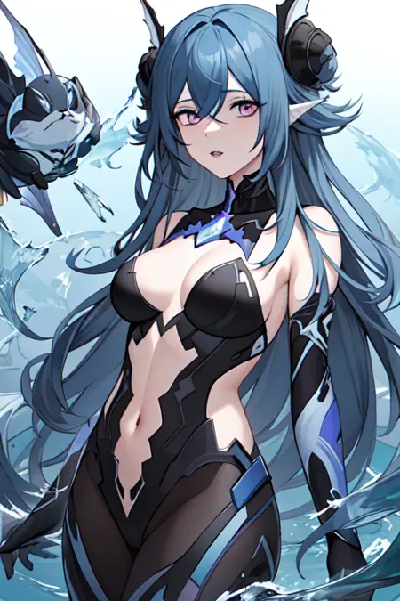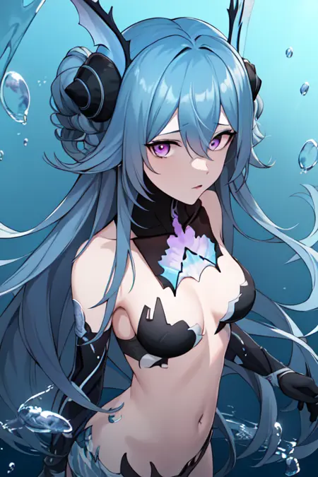 이 캐릭터를 프롬프트하려면 "lora:LamiaPGR:strengthLamiapgr, 파란색 립스틱, 파란색 아이라인, 기호 모양의 눈, 다색 머리카락, 분리형 칼라, 접착식 브라, 머리 지느러미, 팔꿈치 장갑,"을 입력하세요. 꼬리를 포함해 프롬프트하려면 "mermaid tail"을 사용할 수 있습니다.