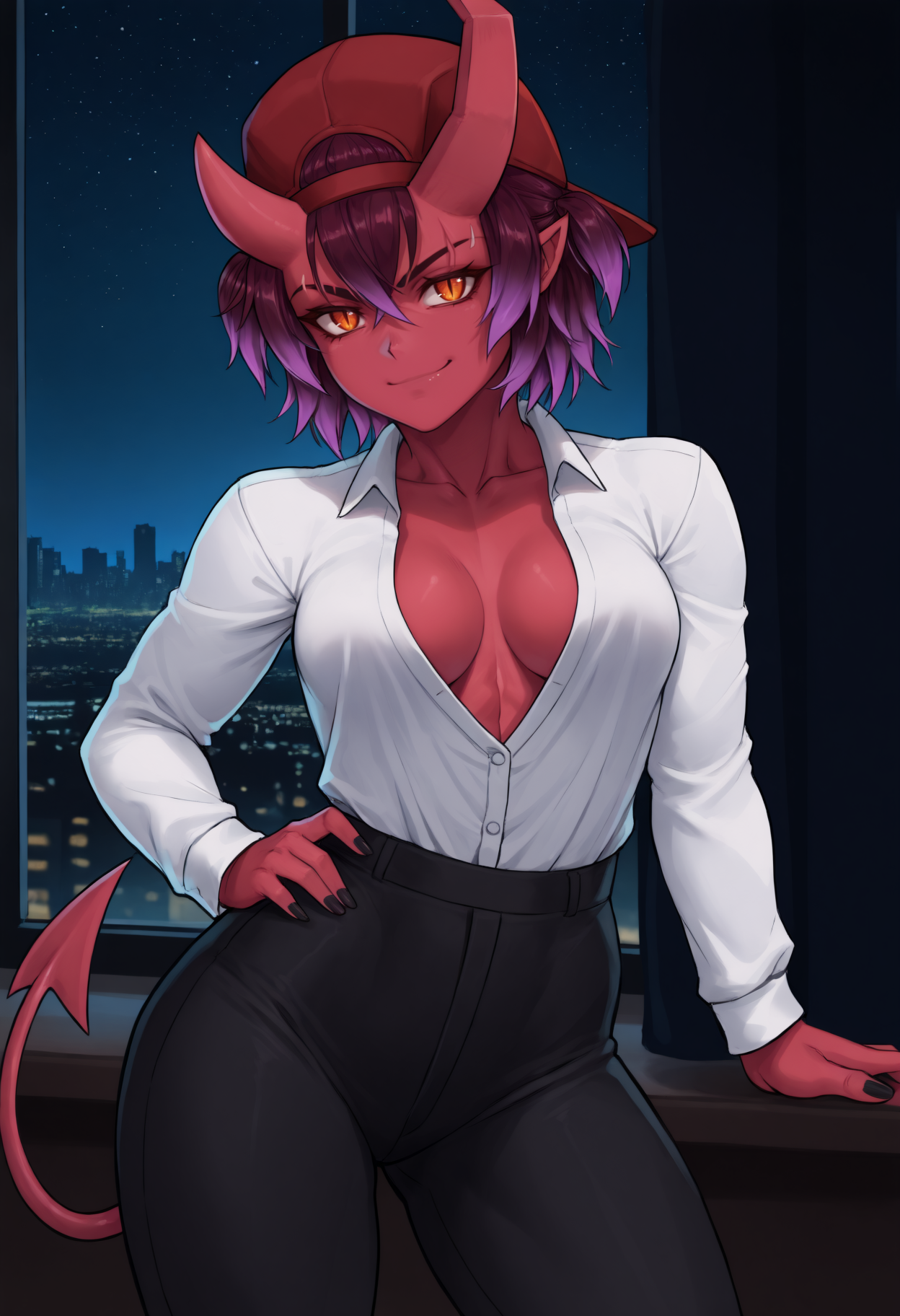 "赤鬼、色付きの肌、鬼の角、折れた角、非対称な角、尖った耳、オレンジ色の目、縦に細長い瞳孔、眉のカット、短い髪、グラデーション髪、目の間の髪、短いツインテール、中くらいの胸、悪魔の尾、引き締まった体"