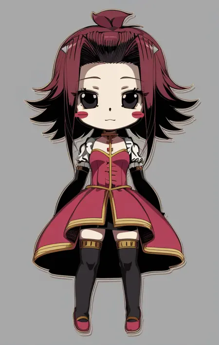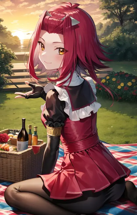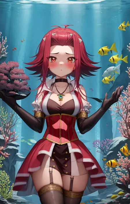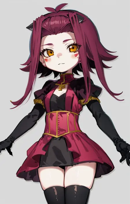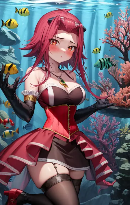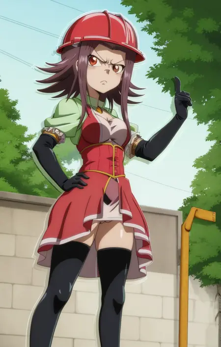 'Akiza Izinski (Yugioh), red dress, elbow gloves, puffy short sleeves, thighhighs, parted bangs' should get you the normal rather short dress. 'Red bodysuit' is trained on the bikesuit but it's kind of hit or miss. 'Corset' as needed if it's missing the center piece of the dress.