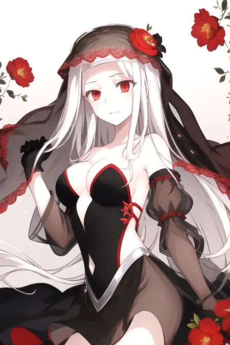 BlackIriVeil, 1girl, solo, long hair, hair ornament, red eyes, black gloves, black dress, cleavage, medium breasts, white hair, detached sleeves, hair flower, red flower, pale skin, black veil, white skin, corruption, irisviel von einzbern